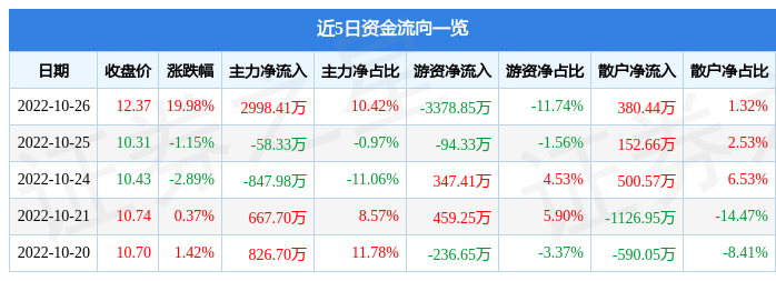 数据方面资金流向,流入2998.41万元10月26日主力资金净,378.85万元游资资金净流出3,380.44万元散户资金净流入。