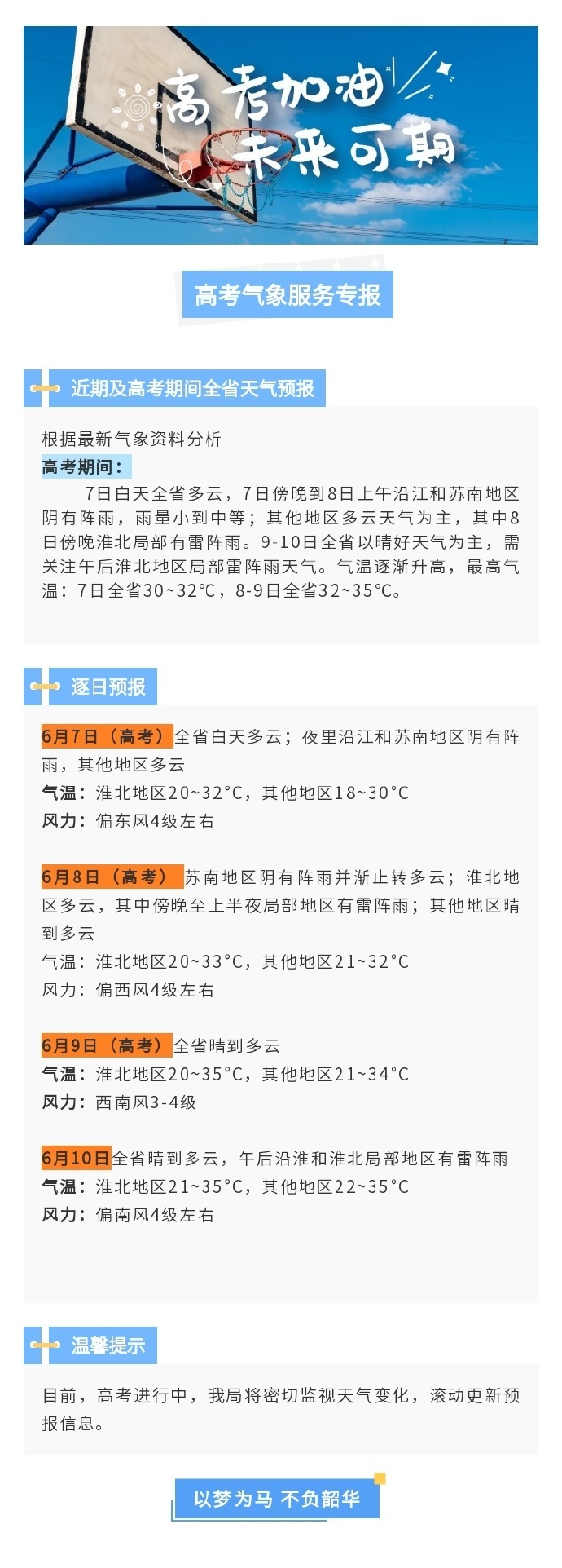 高考形势任事专报据省形势台公布的,象材料阐发遵照最新气,全省多云7日白昼,江和苏南地域阴有阵雨7日黄昏到8日上午沿,到中等雨量幼;云气象为主其他地域多,北片面有雷阵雨此中8日黄昏淮。省以晴好气象为主9日至10日全,区片面雷阵雨气象需合切午后淮北地。渐升高气温逐,全省30~32℃最高气温:7日,省32~35℃8日至9日全苏沿江苏南地区有雨后天晴。